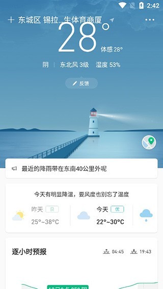 1、街道级定位,通过GPS定位技术,将天气预报细化至用户所在街道或小区,告别“局部地区阵雨”的笼统描述。