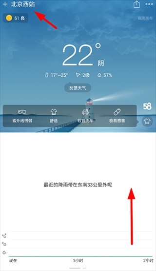 1、首次打开彩云天气,系统会自动完成定位,当然也可以手动选择地点。