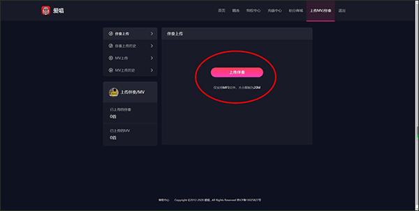 1、使用电脑进入爱唱官网,在官网页面点击上传MV/伴奏。