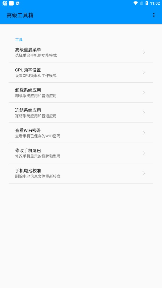 3、当前功能包括:CPU调频设置,卸载系统应用,冻结系统应用,调节屏幕DPI,查看WIFI密码,修改手机尾巴,手机电池校准!