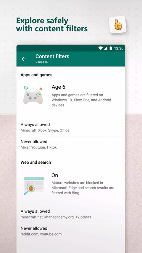 3、家长可以阻止或允许家庭成员在 Windows、Xbox、Edge 和移动设备上使用特定应用。