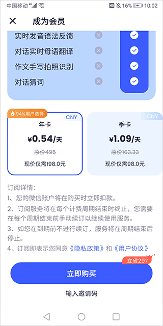 星空外语会员主要分年卡、季卡、月卡,费用可以在app会员界面中查看