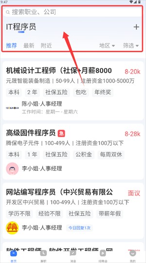 2、选择求职功能后,在上方搜索框输入心仪的职位或企业名称。