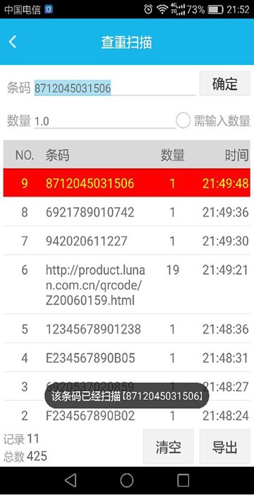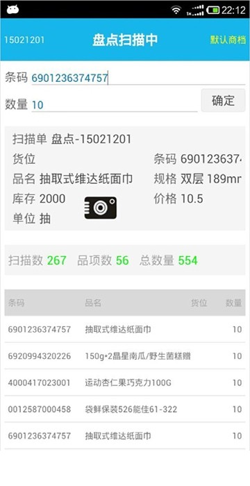 输入货位、数量等附加信息后,通过手机摄像头或PDA扫描头扫描条码。