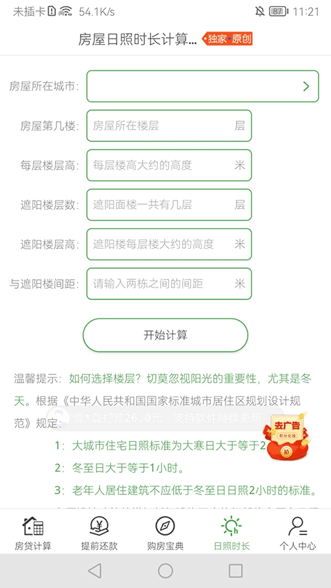 4、输入房屋信息,软件将自动计算出该房屋日照时长。