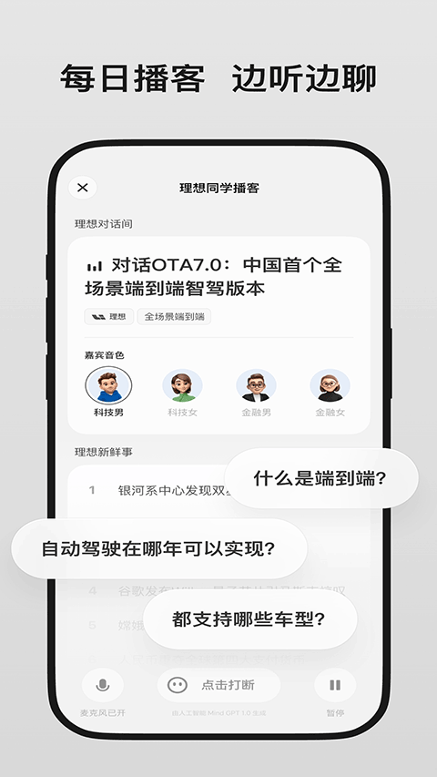 3、用户可以自由选择嘉宾音色,边听边聊,每日精选推送让用户轻松掌握最新资讯。