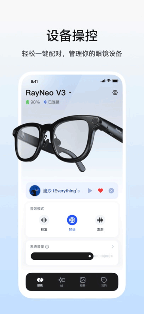 雷鸟AR眼镜是一款为雷鸟X2和V3系列AR眼镜设计应用程序,用户可通过手机与眼镜的无线连接方便实现控制权力,可以随时管理眼镜中的各项设置,不限于亮度调节、音量控制等等,支持多种内容的管理与分享,尽情的浏览,选择要推送的照片、视频等多媒体内容。