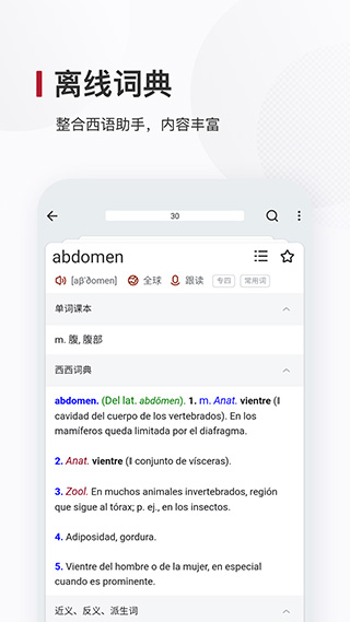 2、海量分级词库,覆盖12+主题领域,整合现代西班牙语教材,满足零基础入门到高阶进阶全阶段需求。