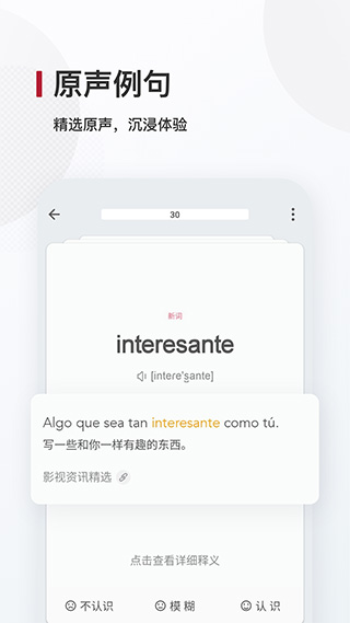 2、真实语料支撑,涵盖电影台词、剧集对白及Telediario、Radio ONU等专业新闻,帮助理解语境。
