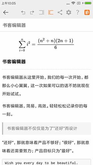书客编辑器是一款功能丰富、界面简洁的手机端富文本编辑器,支持Markdown标记语言、Latex数学公式、网页图片预览、笔记本地保存和文件分享等功能,可通过简洁的语法快速排版文本,无需复杂操作即可实现标题、列表、代码块等格式,提升写作效率。所有内容可安全存储在本地设备,无需依赖网络,确保数据隐私性和随时访问的便利性。