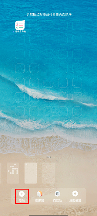 1、手机桌面页面双指捏合或者桌面空白处长按,选择【添加】