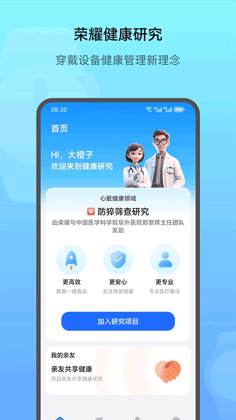 荣耀健康研究是一款由荣耀携手中国医学科学院阜外医院等权威机构共同打造的智能化健康管理平台,通过荣耀智能穿戴设备(如手环、手表)实时捕捉心律、血氧等数据,实现24小时心脏健康动态追踪,采用专业医疗级算法,精准识别房颤、早搏等心律失常问题,筛查准确率达临床标准。与中国医学科学院阜外医院等权威机构合作,提供专家随访、在线咨询及就医推荐服务。