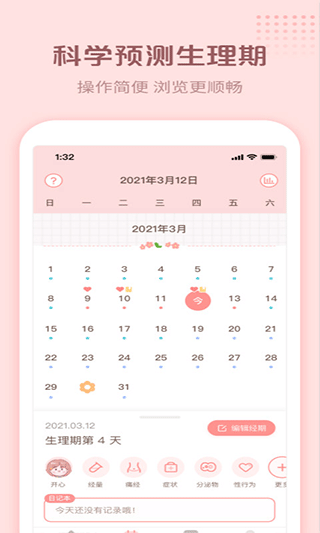 1、科学预测与贴心提醒,基于智能算法精准预测生理周期,提前推送经期、排卵期及易受孕期提醒。