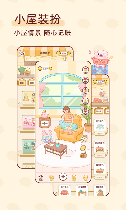 1.记账小屋:用户可以在温暖的小屋中进行记账,萌猪形象为用户的记账行为添加了趣味性。用户通过完成记账任务可解锁小猪形象并装饰虚拟家园,如购买漂亮家具、选择家园主题等。