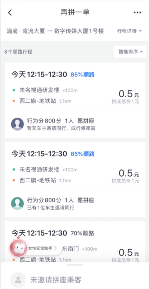 进入再拼一单行程列表页,可继续查找愿拼座的顺路乘客