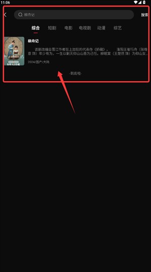 2、在首页搜索栏输入想看的影视名称,例如柳舟记。